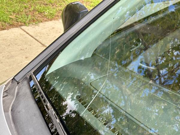 Cracked on the lower passenger side from a rock strike during a trip to Oceanside. The crack runs toward the A-pillar but hasnβt obstructed visibility.