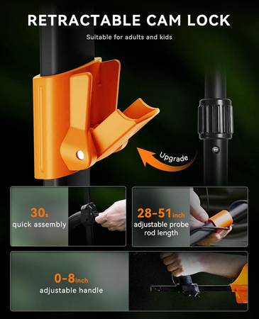 [Upgraded Product Structure] Lightweight metal detector boasts an upgraded telescopic cam lock design, enabling quick assembly in just one minute. With adjustable detection and forearm rods, it caters to different sizes, both adults and kids, ensuring a comfortable and personalized experience.