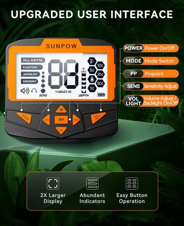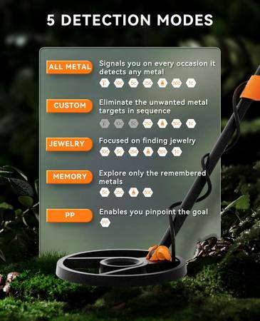 [5 Modes and 7 Kinds of Target Metals] Unleash the full potential of your treasure-hunting skills with 5 optional modes: ALL METAL, DISC, MEMORY, JEWELRY, and PINPOINT. Easily identify 7 kinds of metals, while the memory function saves your preferred settings, eliminating the need to reset each time you start.