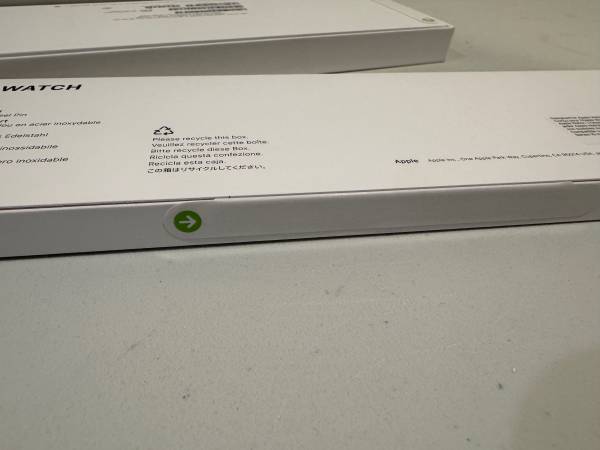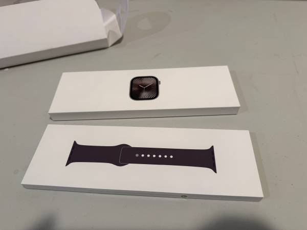 Brand new, unopened, still in case. Apple Watch 46 MM natural titanium smart watch with large grey sport band.