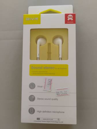 This is a brand-new stereo in-ear earphone in the original packaging. The brand is Aivr.