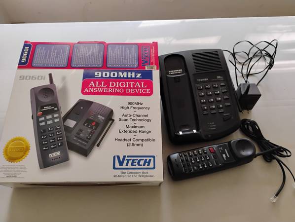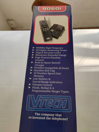 This is a VTech 9060i 900Mhz All Digital Answering Device with power charger and phone cord included. It is a corded telephone with one phone line, featuring a speakerphone function. The unit is in black color and designed as a standalone unit. This answering machine is suitable for home telephones and accessories.