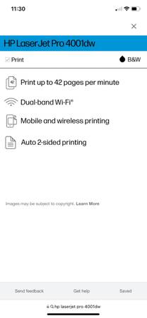 HP LaserJet Pro 4001dw Wireless Color Printer For Sale $250.00. Item#: 41495495 // MFG Part#: 2Z601F#BGJ // By: HP Inc. I am asking $250.00. It has a new cartridge! It has a test print on the last page of the ad! Cash only! Text messages only! show contact info