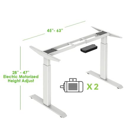 The dual-motor frame lifts at a speed of 1 inch per second, and the intuitive touch screen controller allows for customizable height settings. You can program up to four heights, ensuring you always find the perfect position. The sturdy steel legs feature telescopic height adjustment, ranging from 28” to 47”, and can support up to 220 lbs. The frame length is adjustable between 45” and 63”.