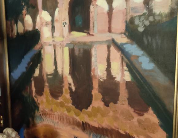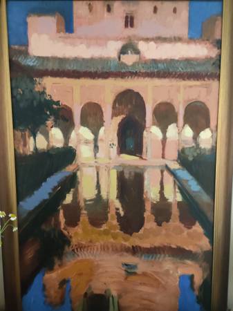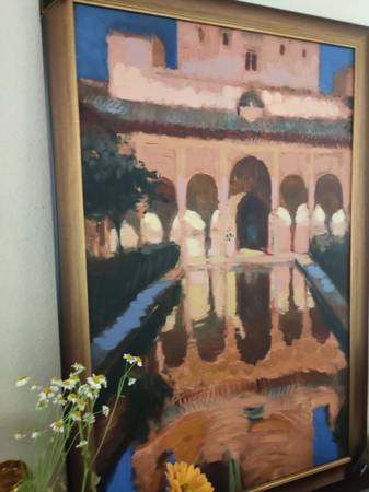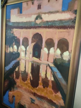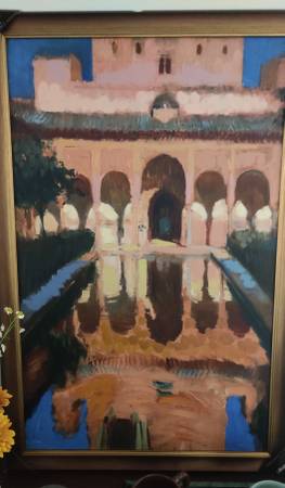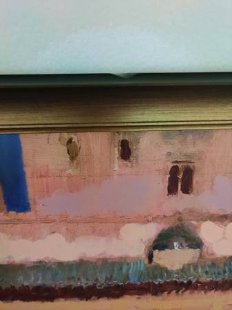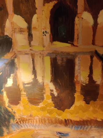New condition, small indentation on top of frame as seen in photo that doesn't take away from this beautiful vintage style piece of art decor, brass color frame which looks like wood but is not wood, to my knowledge it is oil based