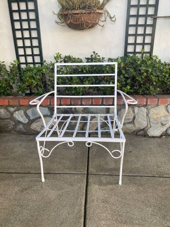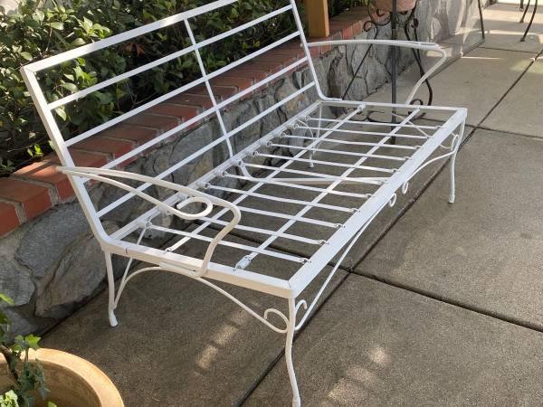 Vintage 4 pc patio set with cushions. Wrought iron patio set includes love seat, rocking chair, stationary chair and glass-topped coffee