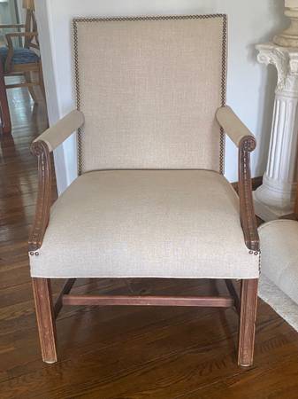 Vintage chair upholstered in Belgian linen with nailhead trim. Stain on seat but matching linen included for repair. $100