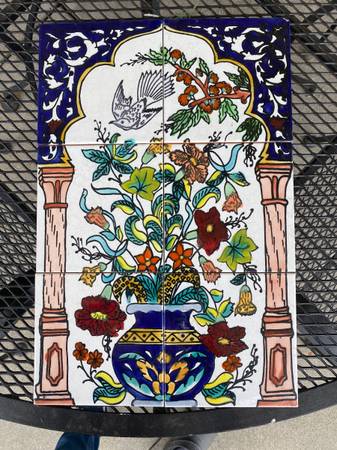 6 ceramic tiles from Tunisia make a 12" x 18" plaque. $20