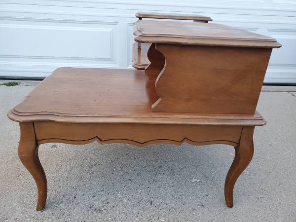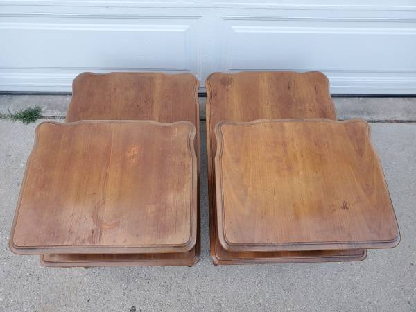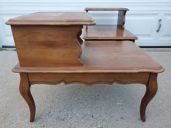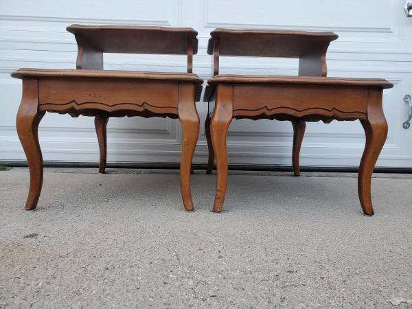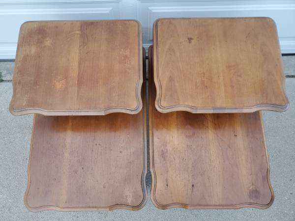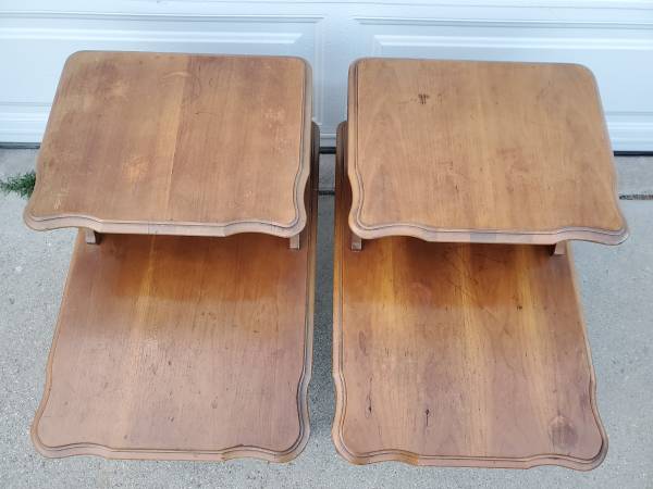 I'm selling a set of vintage solid wood two tier end tables / side tables/ nightstands made by Basset Furniture. 22" high (top tier), 13.5" high (bottom tier), 28" long and almost 19" wide. Some cosmetic imperfections due to years of use and storage, but sturdy and built to last. Asking $200 for the pair or best reasonable offer (cash preferred). PICK UP ONLY in Baldwin Park (91706)!