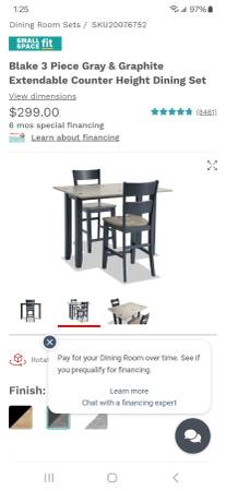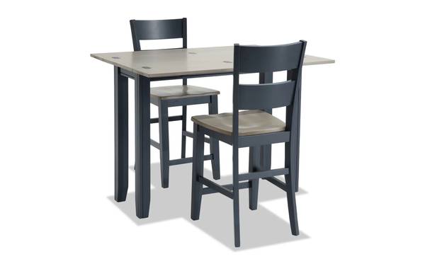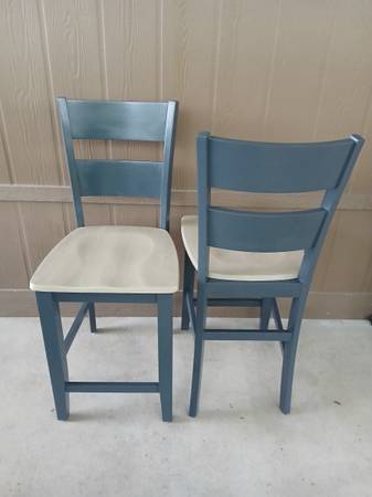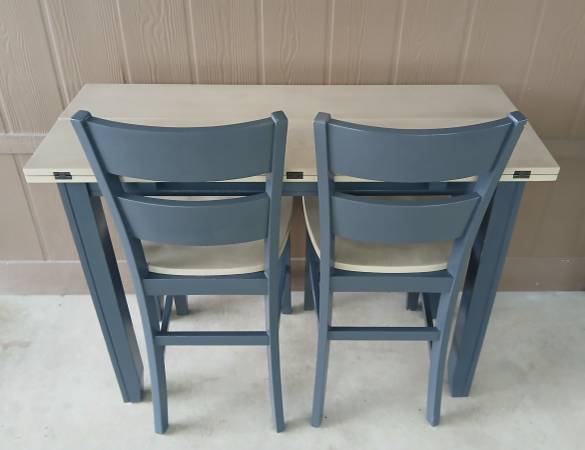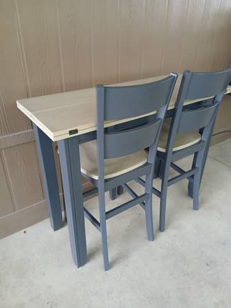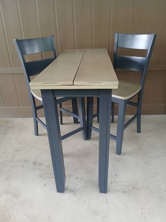 Dinning set used in home staging event. In excellent condition. Counter height table with leaf great for small space's. Height 36 inches width 47 inches with leaf extension 36 x 47. Without 47 X 18 . Great workspace and dinning space with two sturdy solid wood chairs. Dinning table, dinning chairs. Bistro set, dinning set, table and chairs, bar table, bar chairs can be bar, table or desk