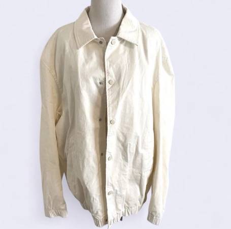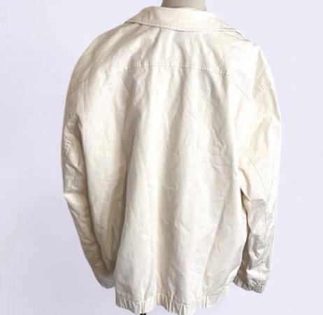 Jacket with lightly padded interior. Lapel collar and long sleeves with elastic cuffs. Welt pockets at hip and interior pocket. Elastic hem. Front snap button closure. Oyster-white