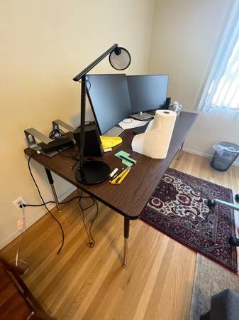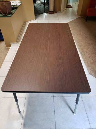 For sale is a large height adjustable activity table from Virco in walnut finish with black sides and chrome legs - 72” x 36” x 30”. The table top is in perfect condition with no wear to note (please note in the first three pictures, the table was a little dirty when pictures were taken). I used this as my computer desk in my home and it easily fit two 27" monitors side-by-side and two laptops on stands to either side of the monitors. It is in like-new condition. Very heavy duty and built to last for years/decades. This is the type of table you would find in either a school or at a business, as well as inside a home. Great for arts and crafts projects where you need a large amount of space. Currently has its legs removed for easy transport. It is in a rented storage facility and the only reason I am selling is I am clearing out my large furniture items in order to vacate the storage. I have many quality home furniture pieces for sale from room and board and ethan allen. The height is also adjustable and the metal legs have holes you can set the height to. At maximum it is at standard 30" height, but can be lowered for kids. The first three pictures show the table when it was lowered to 24" in height, the last three show it in a desk configuration at 30" high. The top is made of a synthetic material and is resistant to staining/water spots.