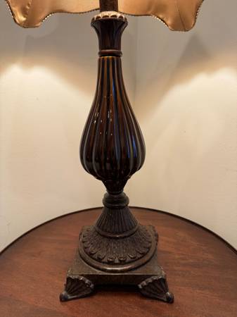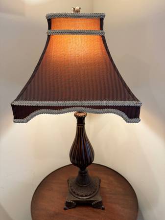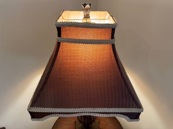 - brown metal - brown porcelain - beautiful fabric lampshade Excellent condition