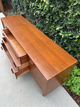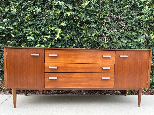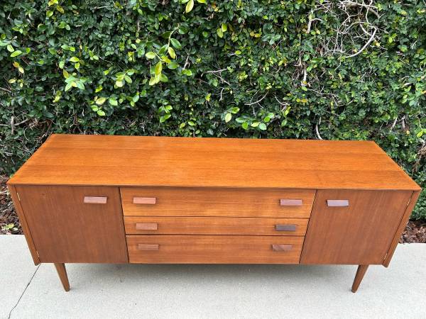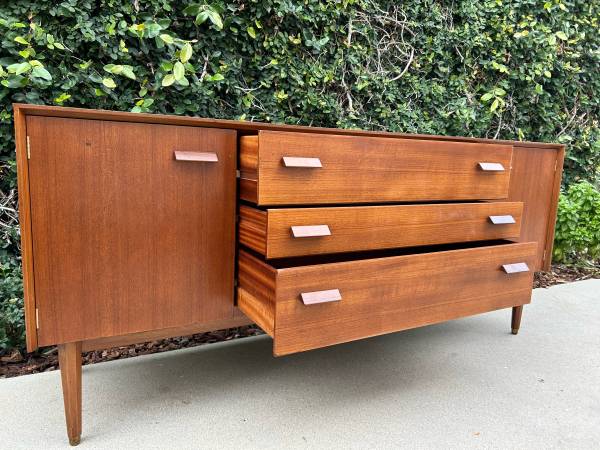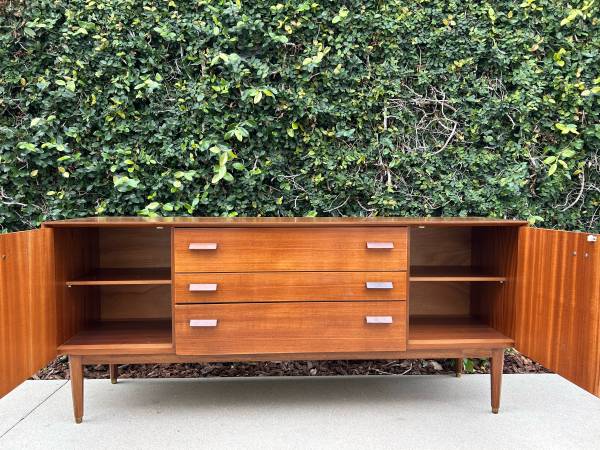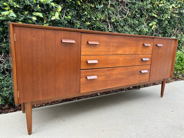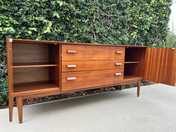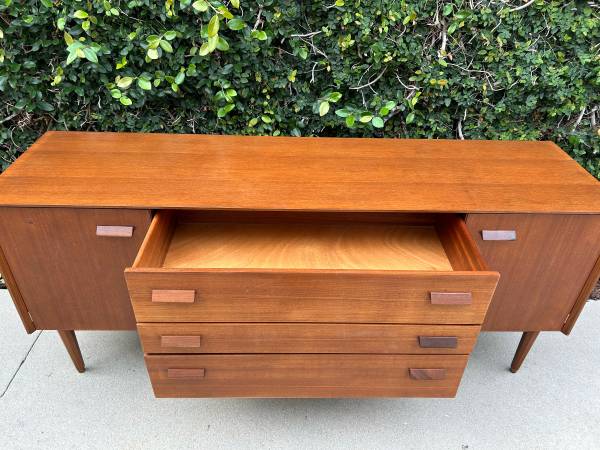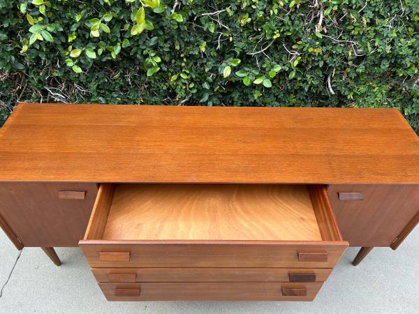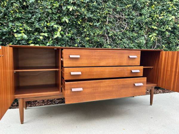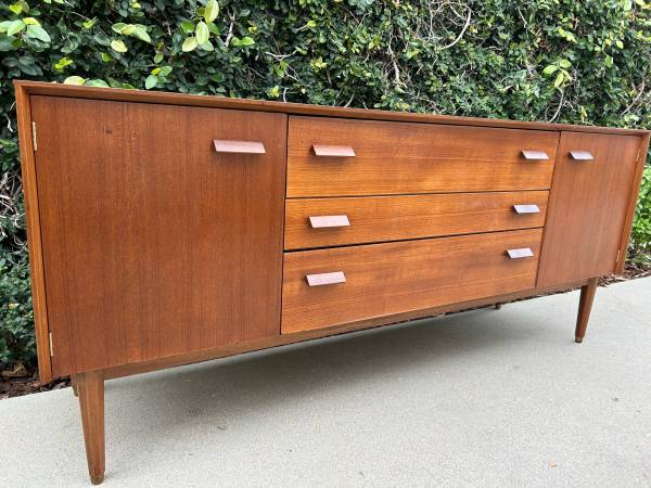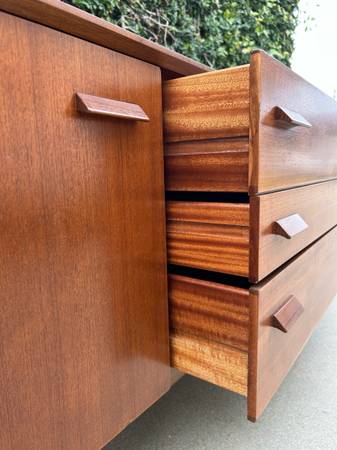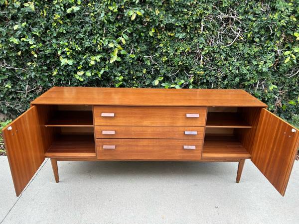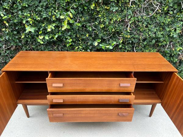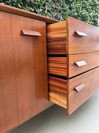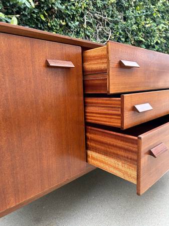 Item #AAZ46 Modern, mid-century modern credenza/sideboard imported from the UK by G-Plan. This beautifully designed piece features three large central drawers flanked by cupboards on each side, each fitted with a removable interior shelf. The sideboard has been professionally refinished, highlighting its timeless elegance.