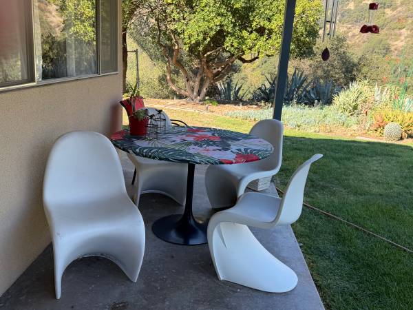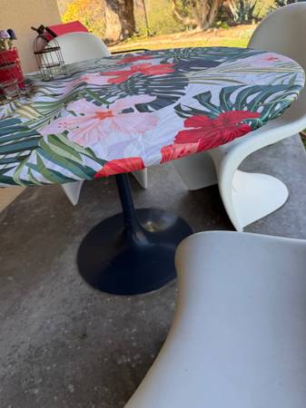 For sale as a set, 4 wave chairs and tulip table. Table has chipped edges, table top in fair shape. We’ve just kept it covered. Chairs can use a cleaning, but they clean up well. Sold only as a...