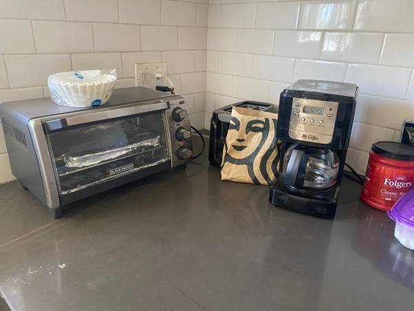 SMALL MICROWAVE, SMALL COFFEE MACHINE, SMALL TOASTER/GRILL, A TELEVISION,