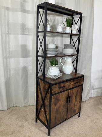 The perfect harmony of rustic elegance and practical design. Organize and display your items on this multifunctional unit with open shelves, drawer and storage compartment. Whether in the living room displaying your collectibles, in the kitchen, organizing dinnerware and appliances, or in the dining room showcasing your crystal ware and fine bottles, this unit adds a modern design. Solid, sturdy construction. Excellent condition; like new.