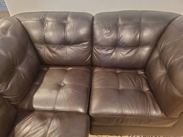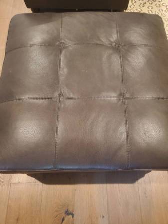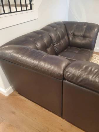 THOMASVILLE BROWN L SECTIONAL SOFA & OTTOMAN LEATHER, TUFTED. DIMENSIONS AS PICTURED 110''X80'' INTERLOCK & INTERCHANGEABLE.