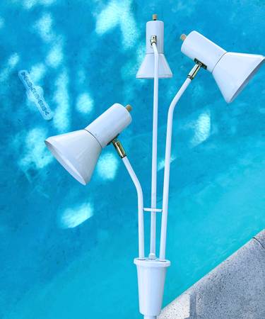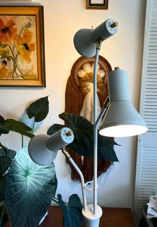 Vintage mid century triple cone floor lamp in white and brass. Each cone can be articulated to where light is needed, including upwards. Dimensions: Approx. 67" in height Condition: Very good...