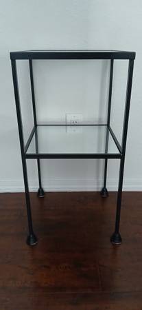Metal and glass side table, brand new metal frame with glass metal top and mirror middle shelf height 25 inches width 13 inches depth 13 inches ,table, side table, two shelf table