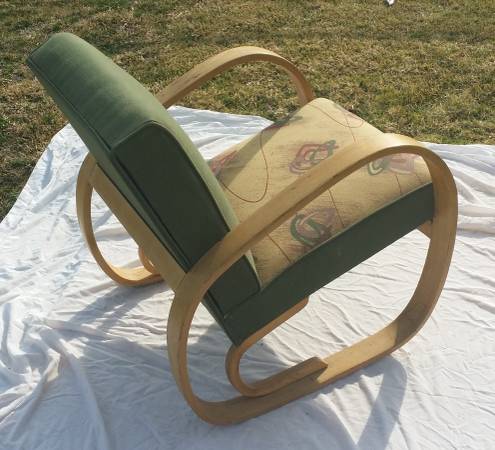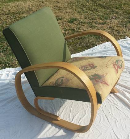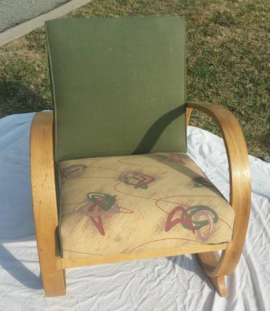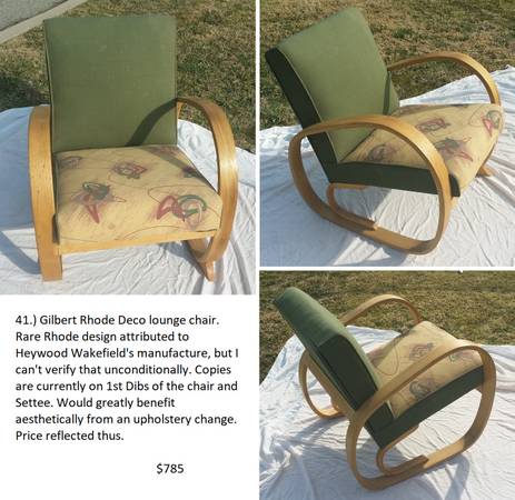 41.) Gilbert Rhode Deco lounge chair. Rare Rhode design attributed to Heywood Wakefield's manufacture, but I can't verify that unconditionally. Copies are currently on 1st Dibs of the chair and Settee. Would greatly benefit aesthetically from an upholstery change. Price reflected thus. $785