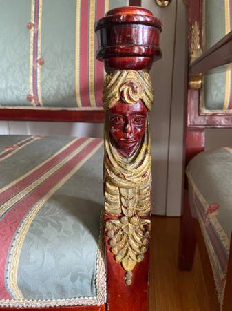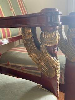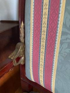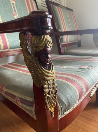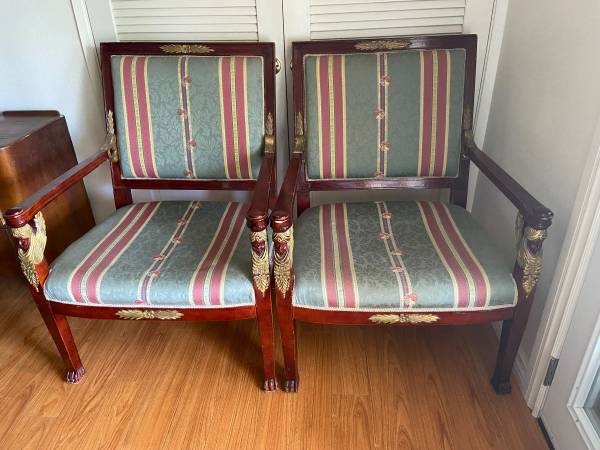 Vintage Empire King and queen Mahogany & Bronze Carved, Upholstered, Armed, over-sized Chairs in excellent condition, OBO