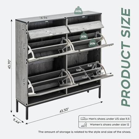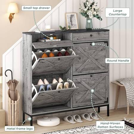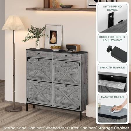 Shoe Cabinet, Large Shoe Storage Organizer Cabinet with 4 Flip Drawers, Freestanding Shoe Rack with Adjustable Shelf for Entryway, Living Room(Grey)