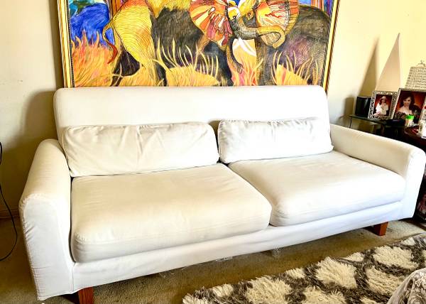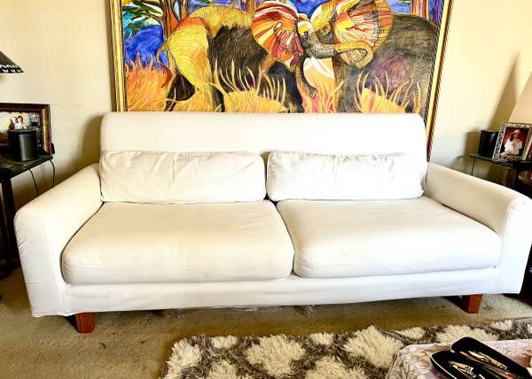 This beautiful white sofa is a contemporary/modern style piece with a sleek wooden frame. It features a single sleeper size, making it perfect for adults to relax and unwind. The sofa has a seating capacity of 3 and is upholstered with 100% cotton fabric, ensuring comfort and durability. With no additional parts or assembly required, this elegant white sofa is a stylish addition to any living room, adding a touch of sophistication to your home decor.