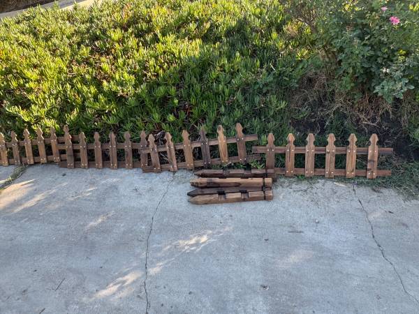 Garden Wooden Designer Picket Fence Height 12 Inches, Width 12 Feet, Configurable Shapes for garden, trees, etc has wooden stakes for sturdy mounting.