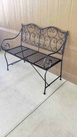 Brand new black powder coated weather resistant iron scroll metal bench holds up to 400 pounds. Great for patio, garden or balcony. Use indoor or outside. Height 38 inches, width 44 inches ,depth 23 inches seat height 18 inches bench seat, has weather resistant floral cushion with reversible cushion Black metal garden bench, Garden bench,metal bench, bench, metal furniture. Outdoor furniture. Outdoor patio furniture. Bench , outdoor metal furniture