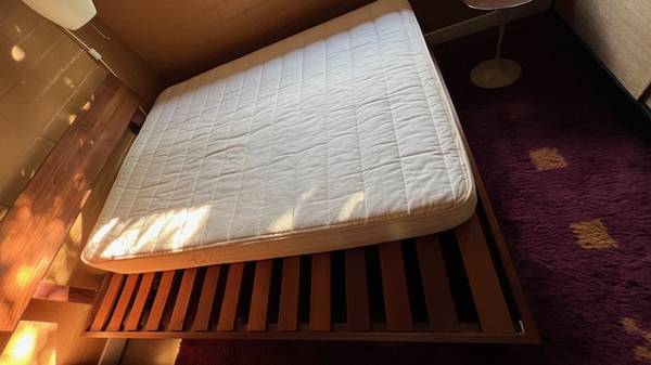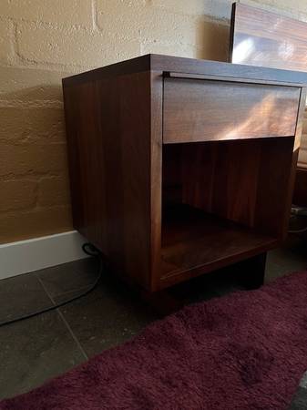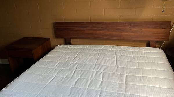 This Room and Board Queen size bed frame with attached head board was only used in a guest room very few times. It is in perfect condition with no scratches or dents. The mattress is made by room and board also. The night stand showing next to the bed is also solid Walnut and is part of the asking price.