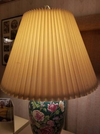 Beautiful Vintage Oriental Porcelain Lamp (Chinese Interest) Foral design. Pleated shade. Rosewood color wood base and top. Height is 28" to top of fineal. Porcelain body is about 8" across. Shade...