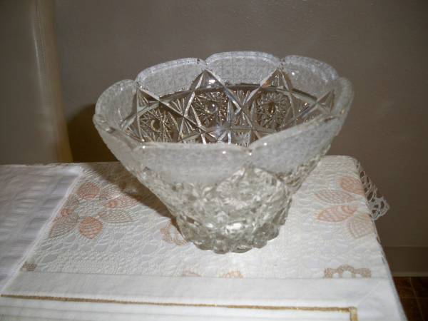 Selling a cut crystal bowl for $10. It is approx. 4.5" high and 6.5" across and has beautiful scalloped frosted design. Please email / text / call if interested.....Thanks