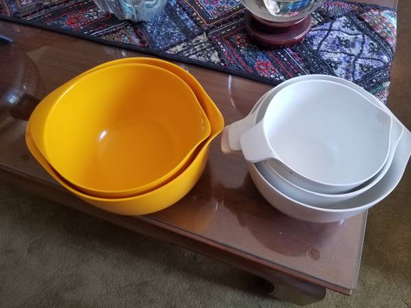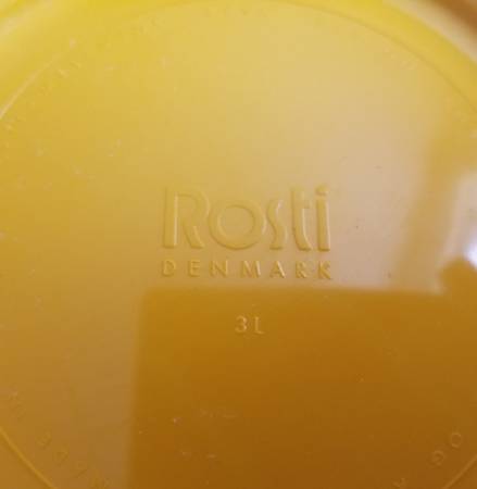 Yellowc2 piece is is Risti Made in Denmark. Sizes are not marked, guessing 3 qt and 4 qt. One yellow bowl has a couple of tiny dings