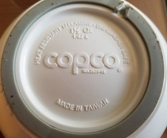 White 3 piece set is Copco Made in Taiwan - 1-1/2 qt, 2 qt, 3 qt