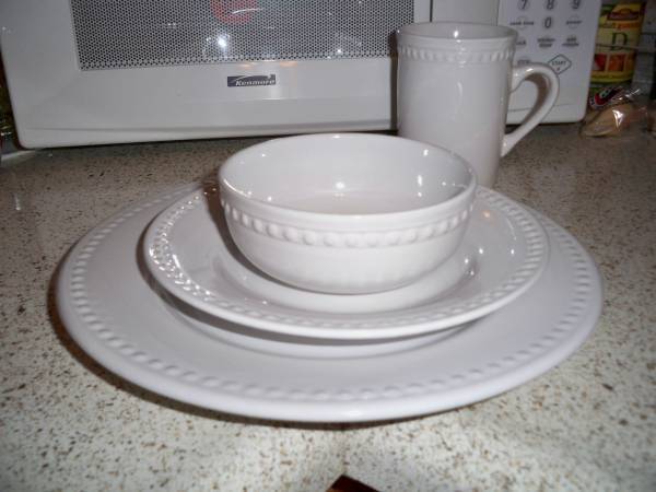 Selling a one 4-piece place setting of white china / dinnerware for $6. They are from J C Penney Home collections and are microwave and dishwasher safe. The place setting consists of: dinner plate,...