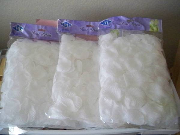 Selling 3 bags of white rose pedals for $10. These are ready to use faux pedals and each bag contains 400 pedals They are in excellent unused condition in unopened plastic bags. Please email / text...