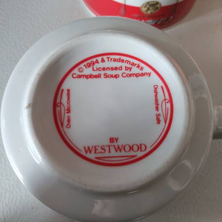 Campbell's Soup Cups Mugs Bowls circa 1994 by Westwood 4 Designs Set of 4 Excellent Condition unused. Where used as a display. Measure 4 inches wide and 2 3/4 height. Pick up 90042 Price $25