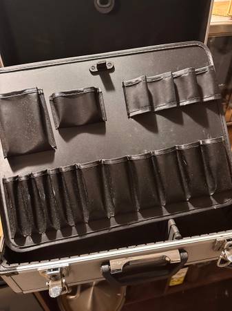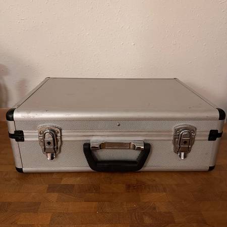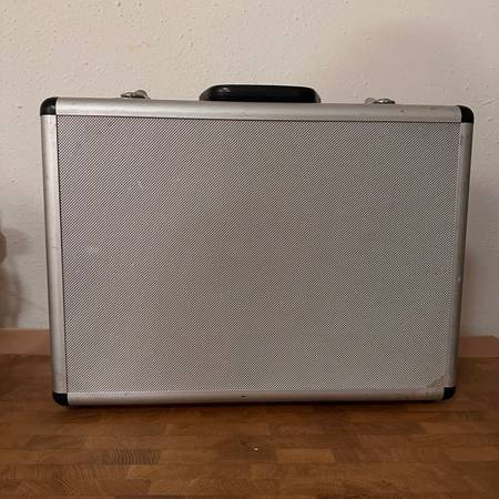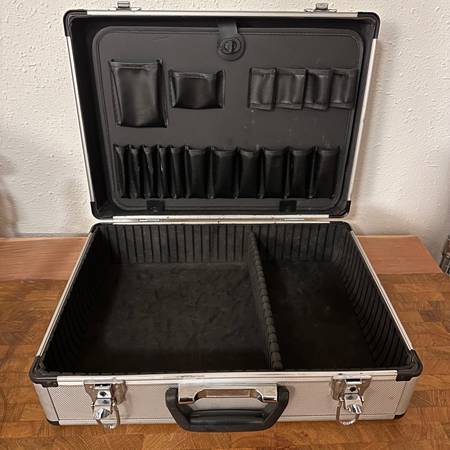 Metal handheld suitcase with foam interior. Scuffs on metal exterior, interior foam is in decent shape, it's not deteriorating. There is a vinyl insert on the top with pockets (also with some scuffs), and one adjustable/removable space divider in the main compartment. Securely latches shut, but no lock, and no brand name.
