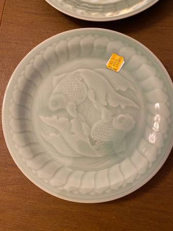 Longquan Celadon Green Koi Fish dishes. Crafted from bone china with a glossy finish, this plate features a beautiful mid-century modern design of a koi fish in a round shape. In excellent condition- no chips or cracks. See pictures.