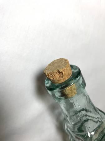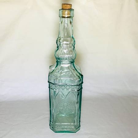 Vintage Light Green Glass Bottle Made in Spain. Hand made vintage pale green bottle made with rich embossed decoration. Very heavy, cork included. Marked Made by Vidrios San Miguel in Spain. Measurements:12” x 3 1/4”