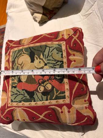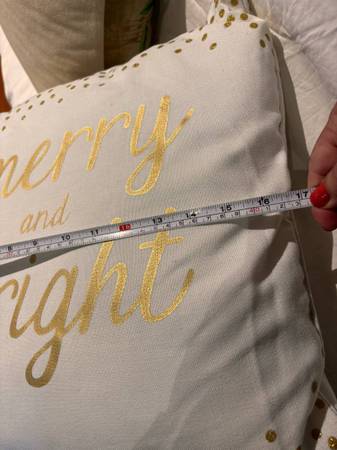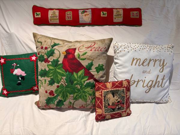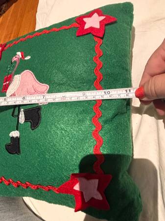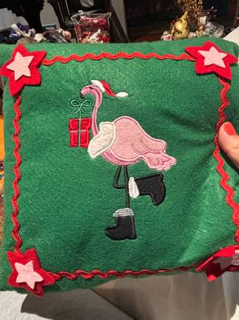 decorative pillows featuring designs like 'Peace', ' down pillow $20 Merry and Bright' $6 Squirrel $15 Flamingo felt pillow $5