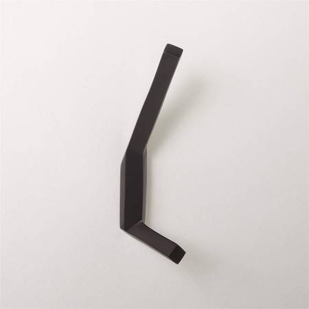 Modern wall hook from CB2 made of solid brass with a matte black finish. Simple and sturdy, works well for coats, bags, or towels. Designed by Mermelada Estudio. 2.5”H x 5.6”W x 0.7”D.