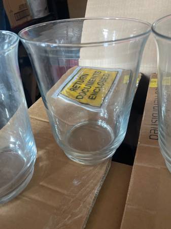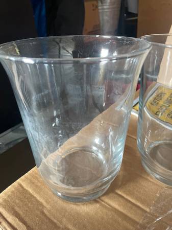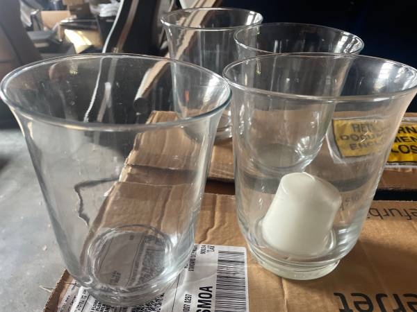 4 matching glass vases/candle holders. Measure. 7” talk x 5.5” wide.