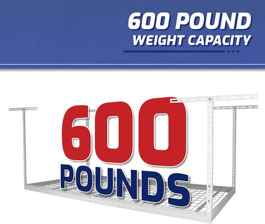 This 4'×8' SafeRacks is a great fit for any garage. It features a full 600-pound weight capacity and adjustable height ranging from 13.5" to 45" inches from the ceiling.