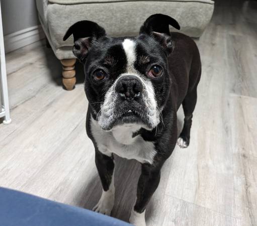 DESCRIPTION: I am a male, black and white Boston Terrier. I weigh 28 lbs. I have white front paws and floppy ears tips. I am fixed and my chip is updated.
