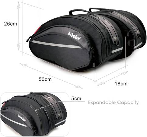 【Expandable 58 L Total Capacity (29 L Each)】 Base size per bag: 20″ L × 10″ H × 7″ W (expandable to 9″ depth) — perfect for helmets, jackets, gloves, and travel essentials.