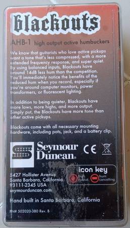 Excellent working active pickup set. This Seymour Duncan Blackouts set comes with wiring diagram, springs and screws. Ready to go.