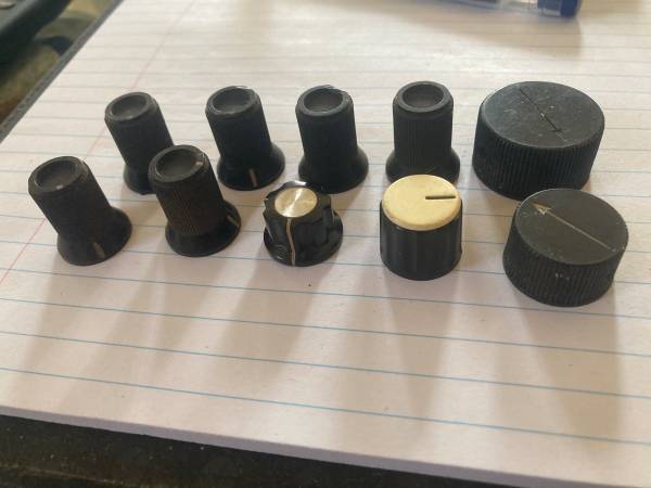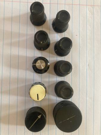 miscellaneous knobs, two vintage World War II knobs, one large one small- a boss fx knob- tall knobs - slider knobs - fx mount plates.. $30.00 all