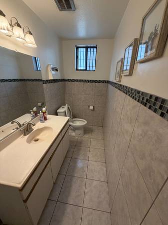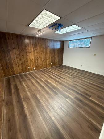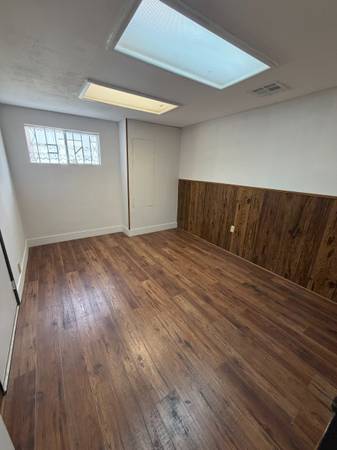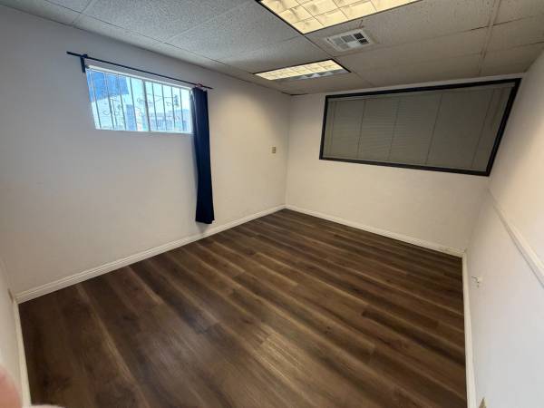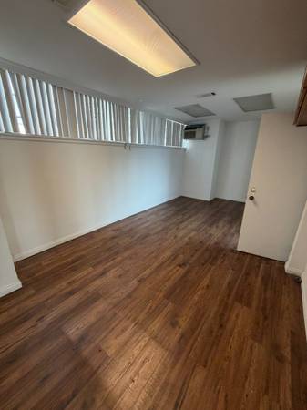 The layout includes a welcoming front entry area filled with natural light from floor-to-ceiling windows, four large private offices, a dedicated bathroom, a private kitchenette, and a spacious walk-in storage closet. Ideal for professional services, creative teams, or any business looking for a well-located, highly accessible office in a vibrant part of town.